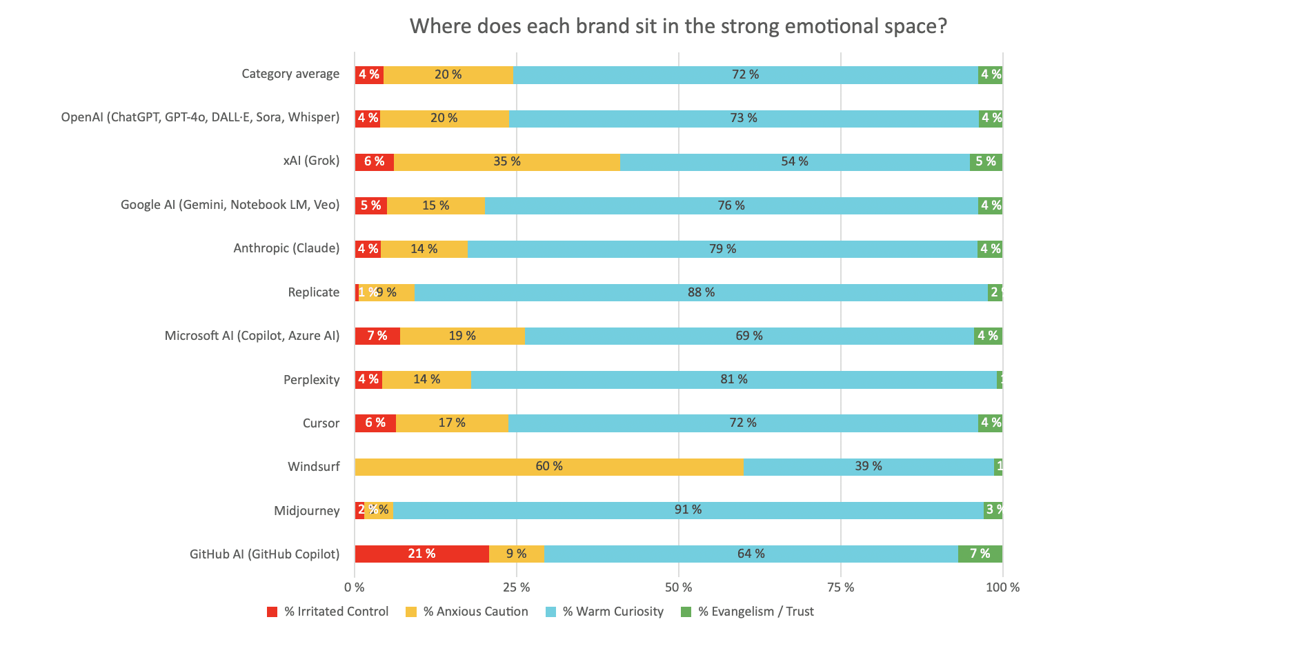 This chart shows how spoken conversations break down across the four emotional quadrants. It highlights, for example, that many AI brands live largely in Warm Curiosity, while a few show meaningful spikes in Evangelism or Irritated Control, signals of higher stakes and deeper user engagement. For example: OpenAI sits mostly in positive, low-friction emotions like Warm Curiosity contrasted by xAI/ Grok, that leans sharply toward negative, high-intensity reactions. In the AI landscape, emotional intensity matters more than awareness.